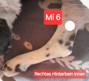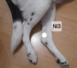 • Beim Hund an den Hinterbeinen, zwischen den Zehen dort, wo sich die beiden Knochen treffen im Bereich der Afterkralle.
